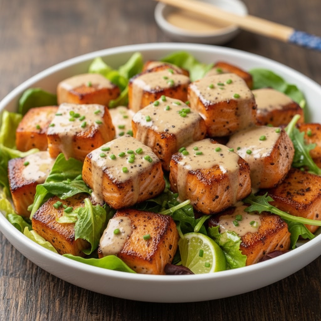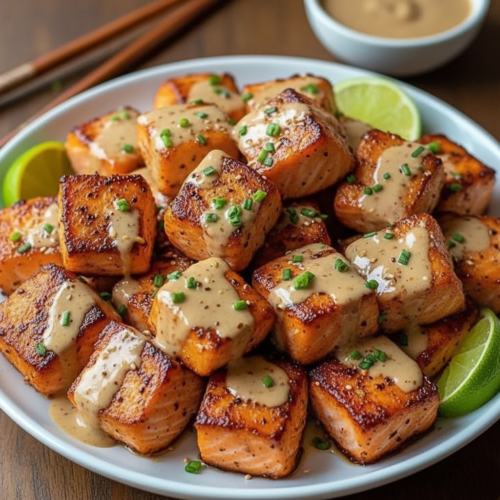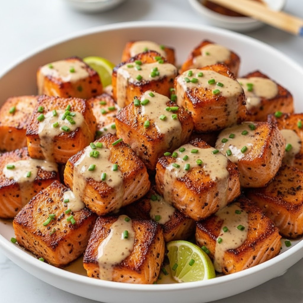 For Air Fryer: Arrange the salmon bites in a single layer in the air fryer basket. Lightly brush or spray with oil. Air fry at 400°F (200°C) for 8–10 minutes, flipping halfway through, until golden and crisp.