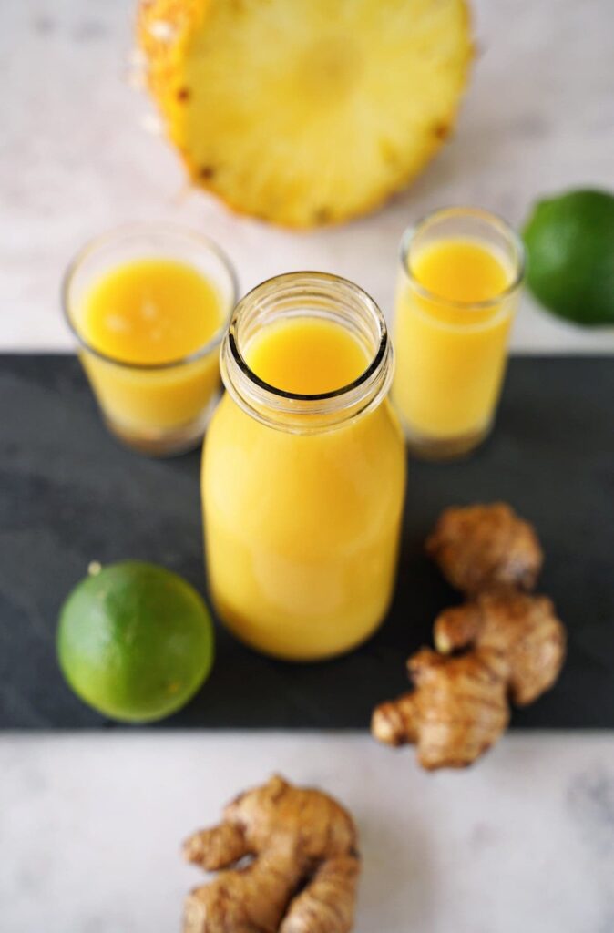 These shots are great for the stomach. Ginger helps stimulate digestive enzymes, reduces bloating, and soothes nausea. Lemon and orange juice add a refreshing acidity that supports gut health.
