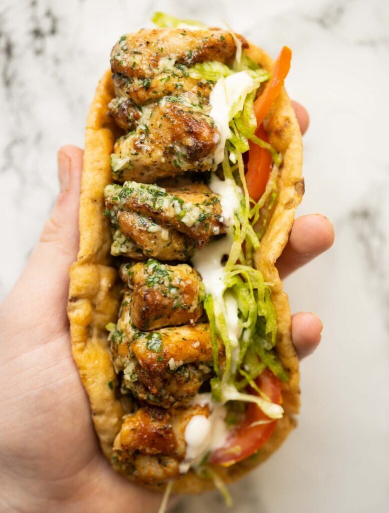 If you’re going for something lighter, wrap the skewers in pita bread with lettuce and ranch dressing for a quick handheld meal.