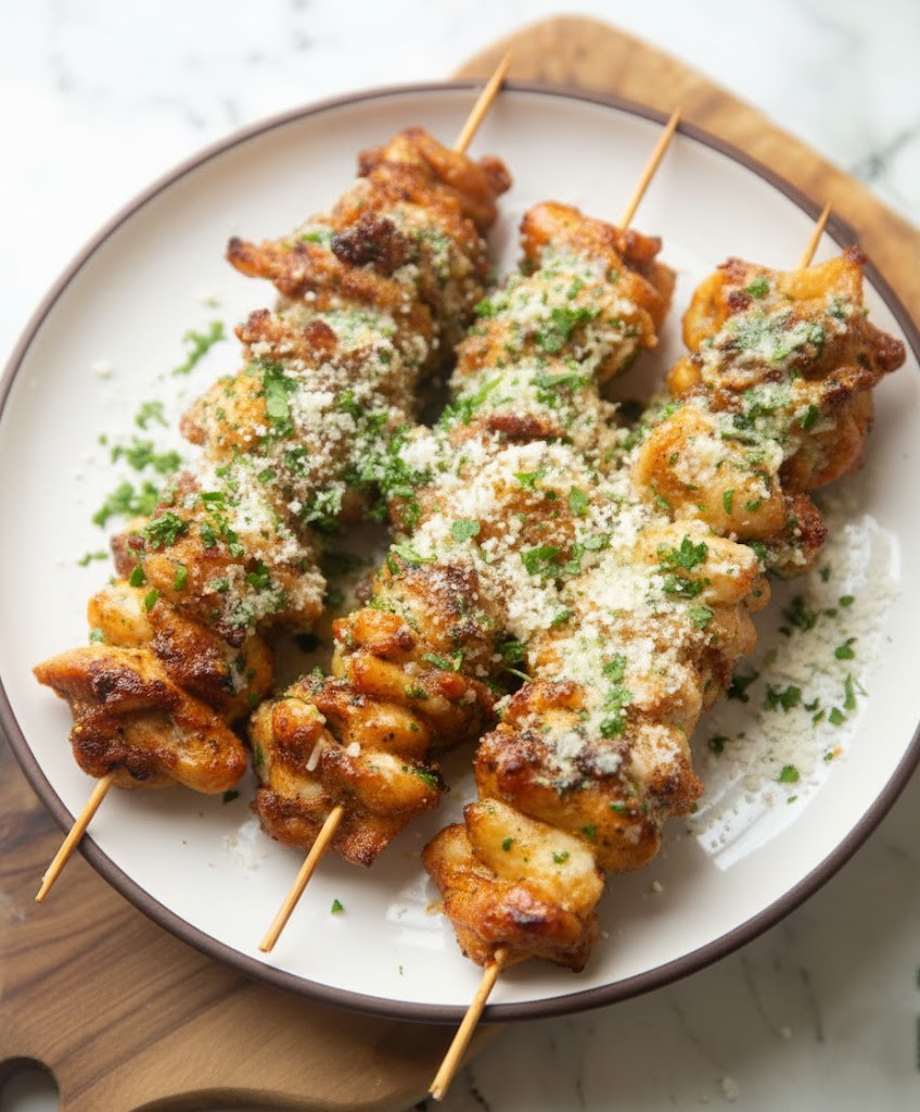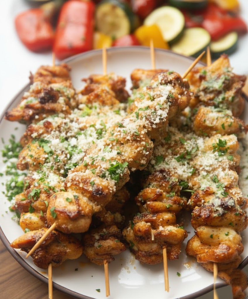 Remove the skewers from the grill and let them rest for a few minutes. Garnish with freshly chopped parsley and an extra sprinkle of parmesan if desired. Serve them warm with your favorite sides or dipping sauces.