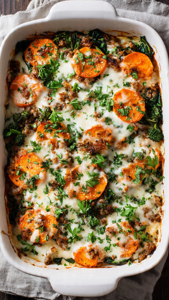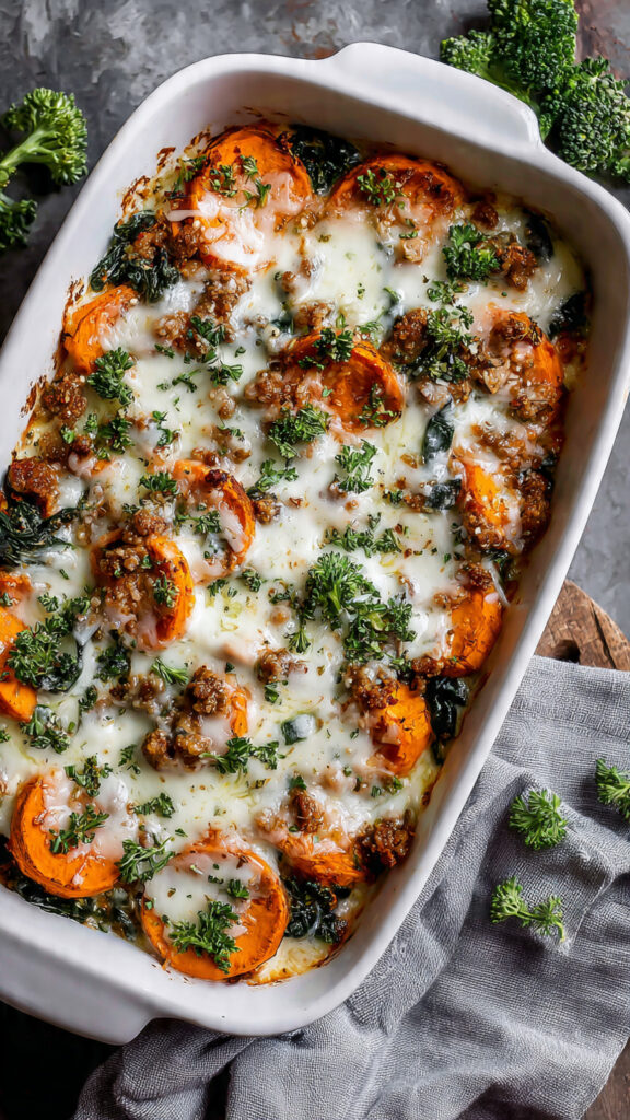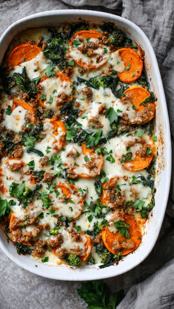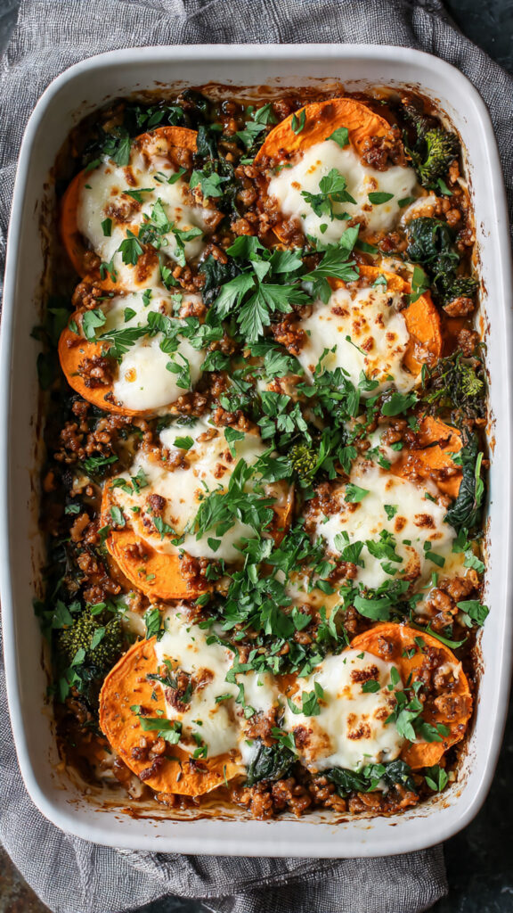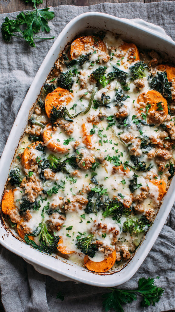 Healthy Ground Turkey Sweet Potato Bake with Broccoli
