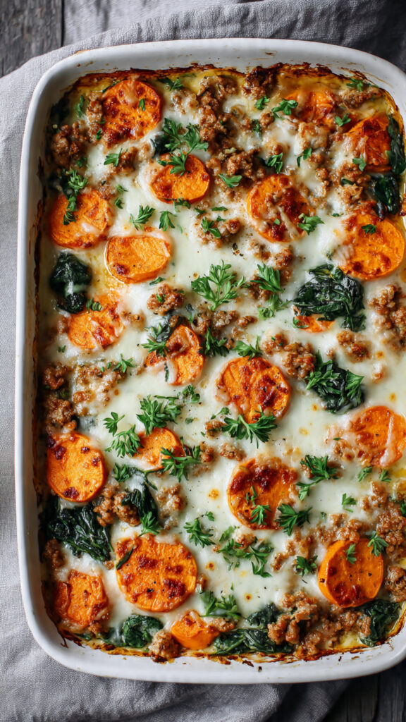 minutesA nutritious one-pan dinner combining lean ground turkey with roasted sweet potatoes, fresh broccoli, and spinach. This wholesome bake is packed with protein and vegetables, making it perfect for easy weeknight meals or meal prep.